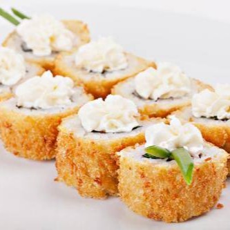 10 peças - bolinho de arroz com salmao e cream cheese empanado, com cream cheese por cima