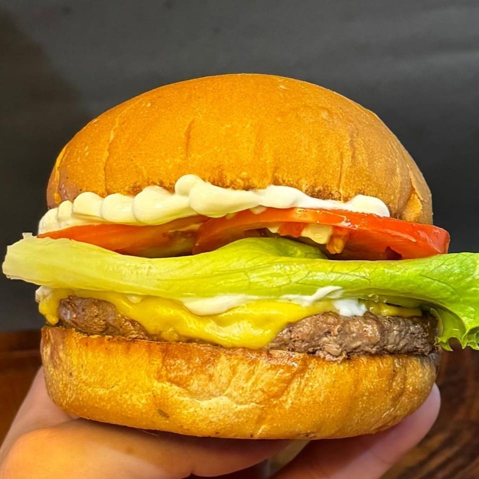Pão, Hambúrguer 100gr, Queijo cheddar, Alface, Tomate e Maionese Caseira