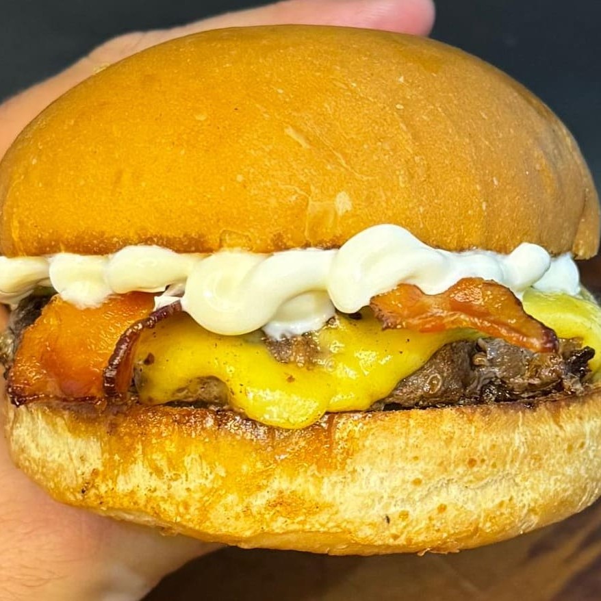 Pão, Hambúrguer 100gr, Queijo cheddar, Bacon e Maionese Caseira