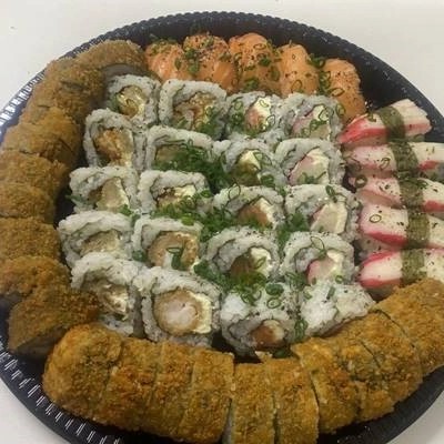 5 Niguiris de Salmão, 5 Niguiris de KanI, 5 Uramaki de Salmão, 5 Uramaki de Kani, 5 Uramaki de Skin, 5 Uramaki de Camarão Crock e 20 cariocas. Acompanha: 2 hashi, 2 shoyos e 1 Teriaki.