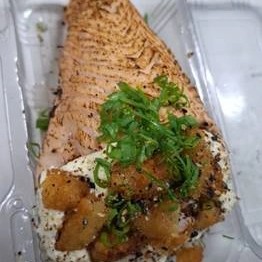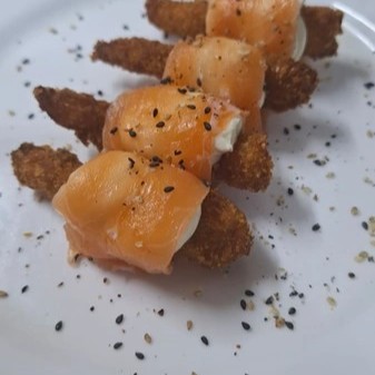 Lâmina de salmão recheada com arroz japonês com uma porção de pasta de salmão com cream cheese por cima. 4 und.