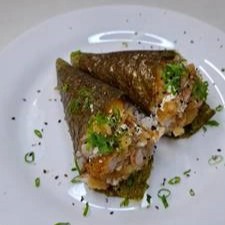 EM DOSE DUPLA! Folha de alga nori enrolada em formato de cone com recheio de arroz japonês (shari), kani fatiado e cream cheese.
