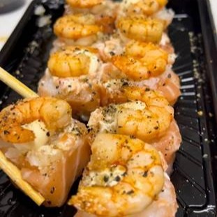Arroz, enrolado na manta de salmão com creme cheese e camarão por cima. Porção com 5 unidades!