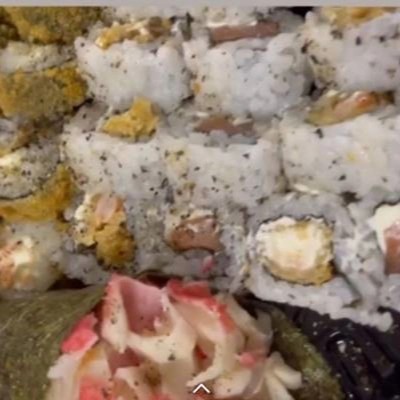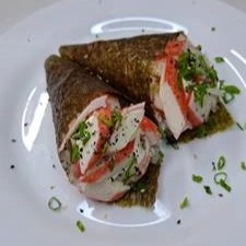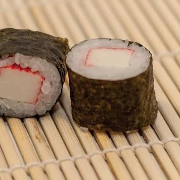 Folha de alga recheada com arroz (shari), kani e cream cheese. acompanha 1 molheira de teriaki, 2 sachês de shoyu e 2 hashis.
