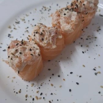 camarão enrolado com bastante cream cheese e uma lâmina de salmão. 4 unidades. Acompanha 1 sachê de shoyu, 1 teriaki e 1 hashi.