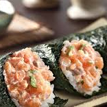 Folha de alga nori enrolada em formato de cone com recheio de arroz japonês (shari), filé de salmão em cubos e cream cheese com 1 molheira de teriaki e 2 sachês de shoyu.