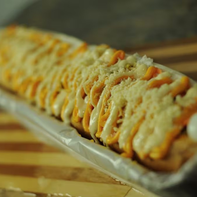Pao de 60 cm salsicha perdigão pure de batata tomate cebola milho queijo ralado queijo cheddar e molhos