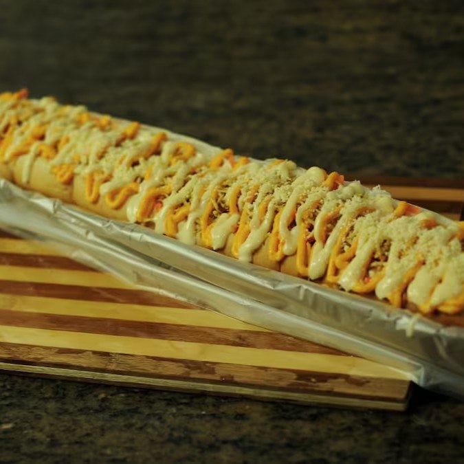 Pao de 60 cm salsicha perdigão picanha pure de batata tomate cebola milho batata palha queijo ralado queijo cheddar e molhos