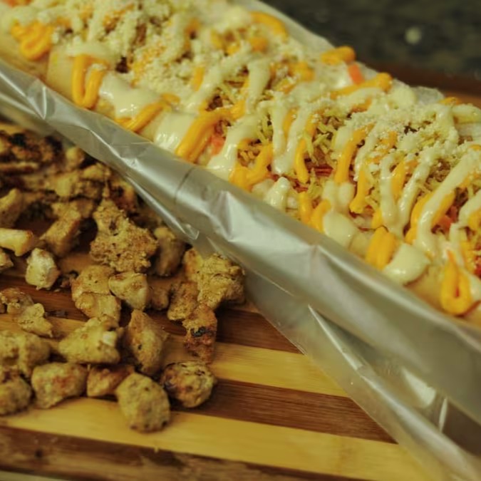 Pao de 30 cm salsicha perdigão frango desfiado pure de batata tomate cebola milho batata palha queijo ralado queijo cheddar e molhos