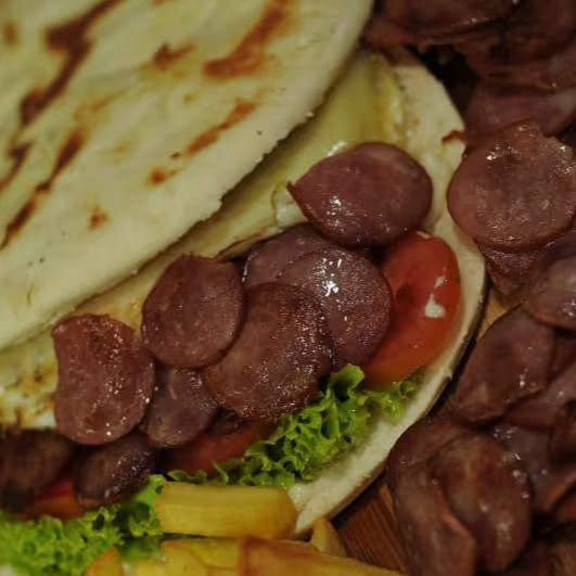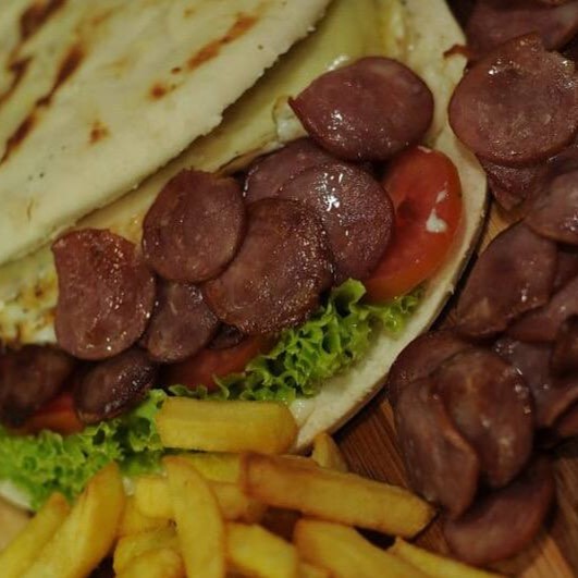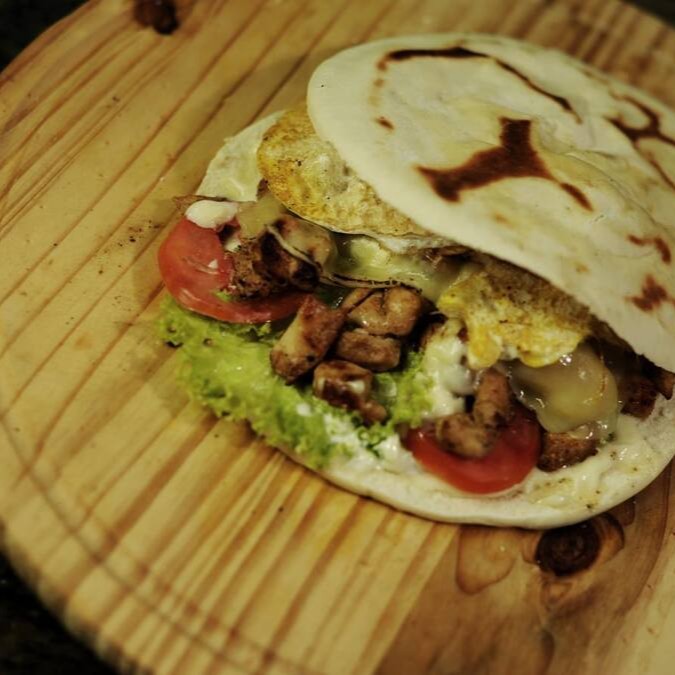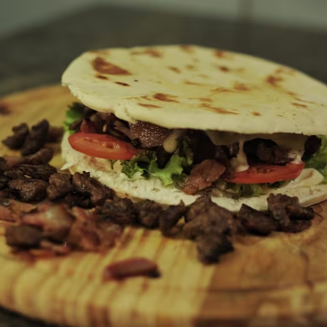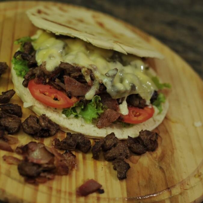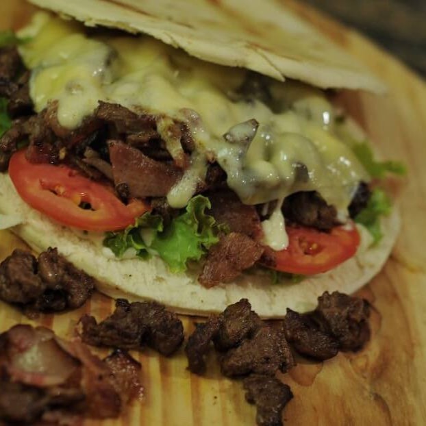 Pao sirio picanha em cubo peito de frango em cubo queijo musarela salada batata frita e molho golaço