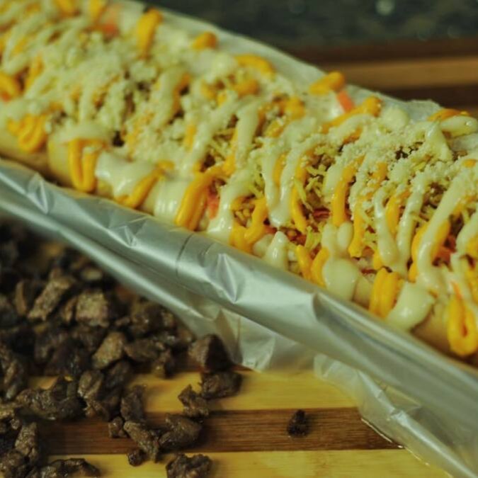 Pão, salsicha, picanha, purê,ovo de codorna, cebola, tomate, milho e ervilha misturados, crocância, queijo ralado e molhos