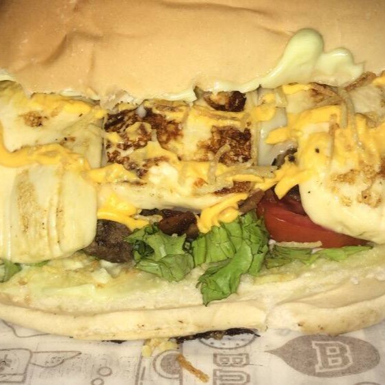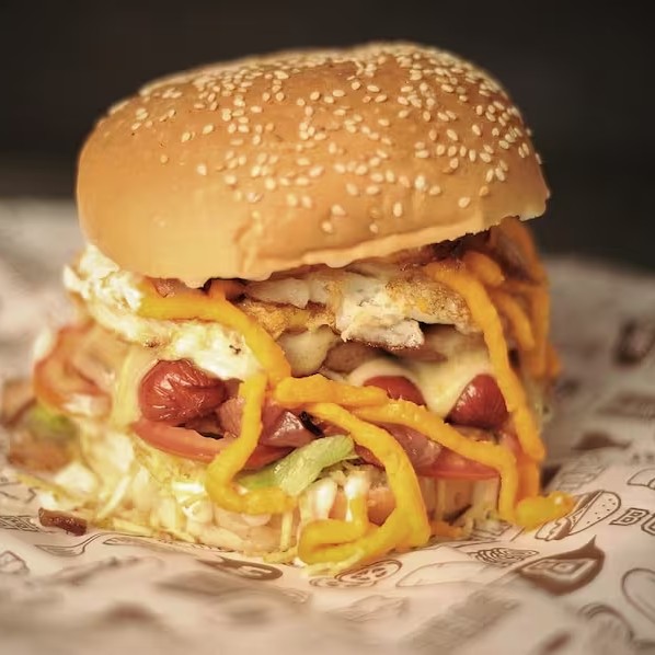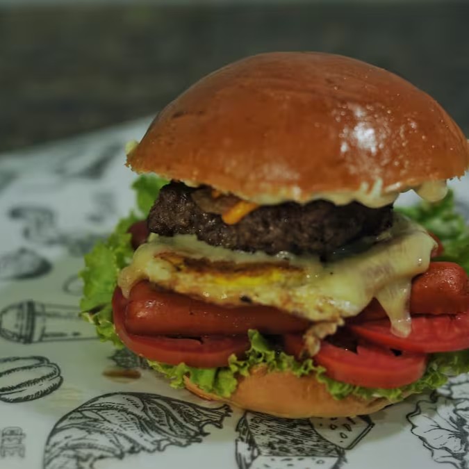 Pao carne artesanal bacon calabresa salsicha ovo queijo tomate alface cebola caramelizada e molho golaço