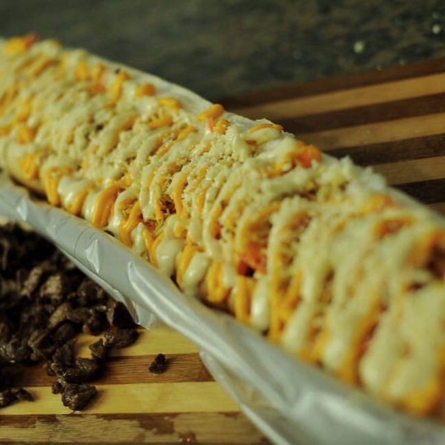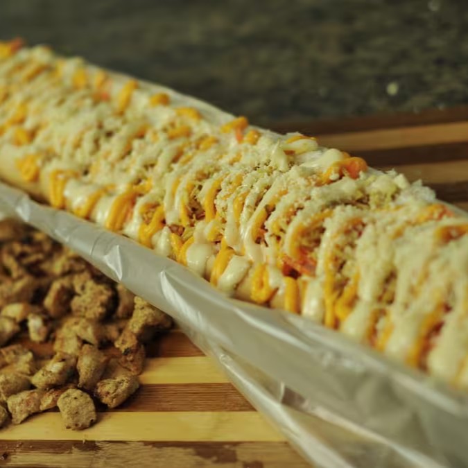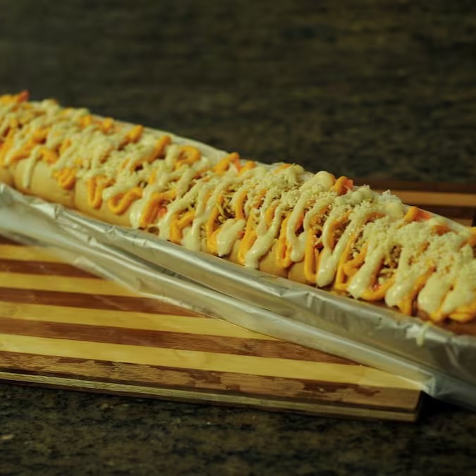 Pão de 60 cm , salsicha , pure de batata ,tomate, cebola, milho e ervilha, queijo ralado, batata palha , ovo de codorna, cheddar, barbecue, mustarda, katchup, molho da casa