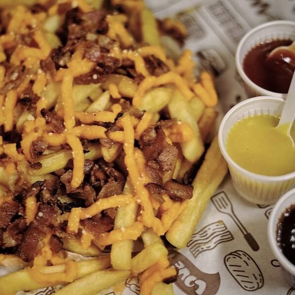 Pao picanha em cubo queijo musarela bacon ovo salada batata palha e molho