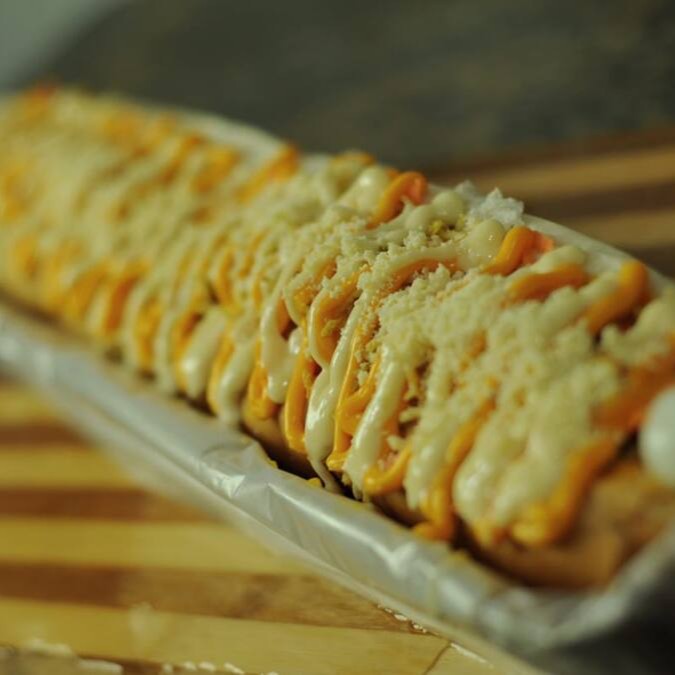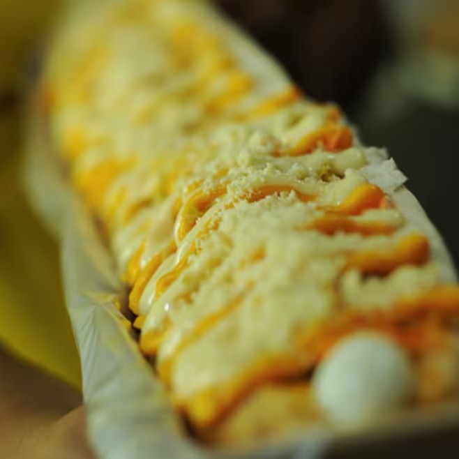 Pao salsicha frango pure tomate cebola milho queijo ralado batata palha ovo de cordona queijo ralado e 5 tipo de molho