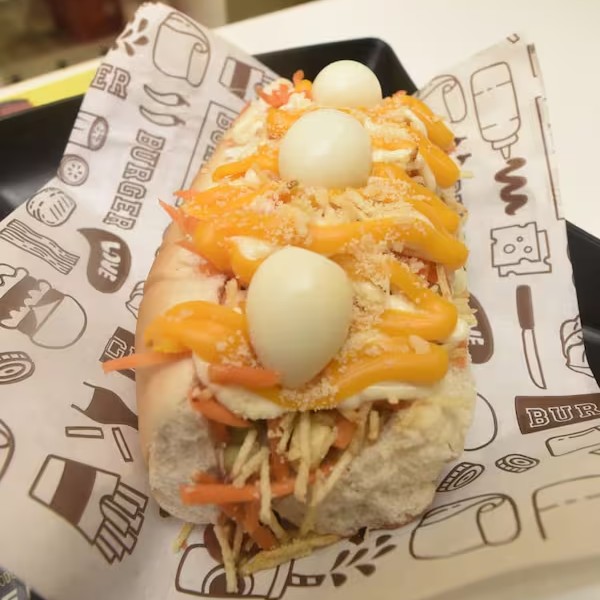 Pão, salsicha, purê,ovo de codorna cebola, tomate, milho e ervilha misturados, crocância, queijo ralado e molhos