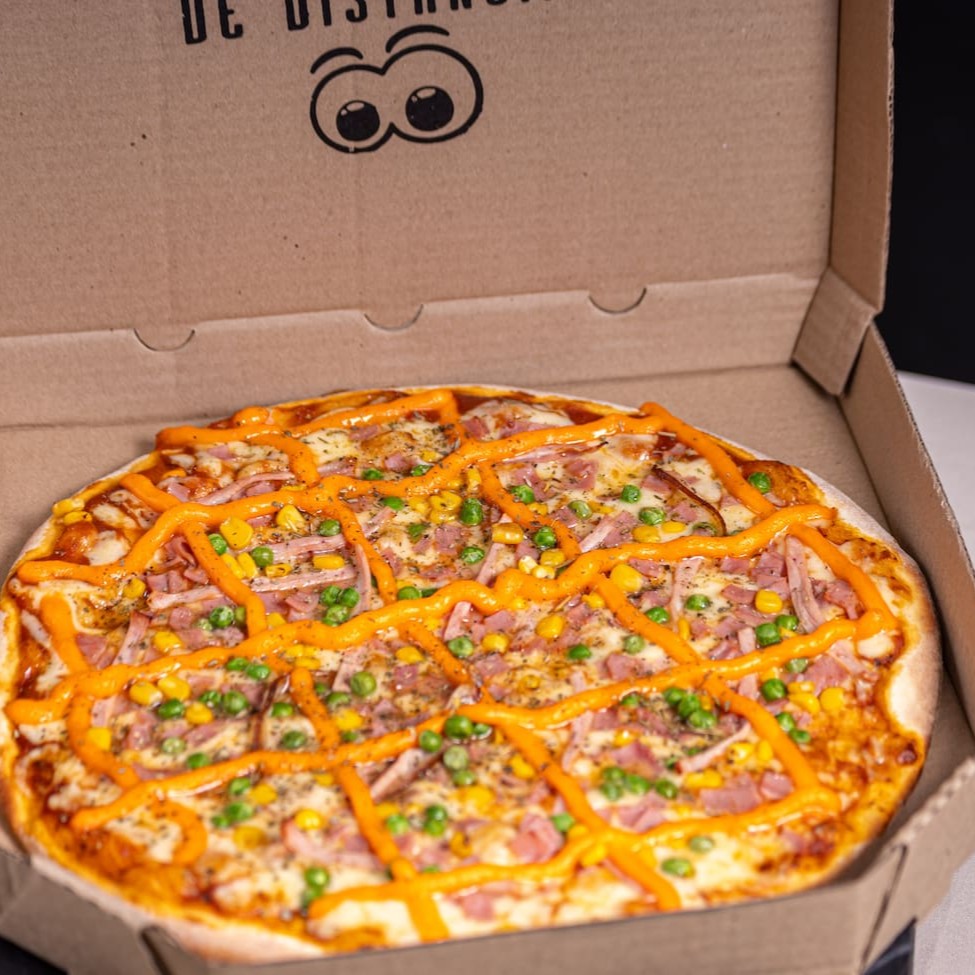 Massa fina, molho de tomate da casa, mussarela, bacon, presunto, milho, ervilha, cheddar, azeitona e orégano.