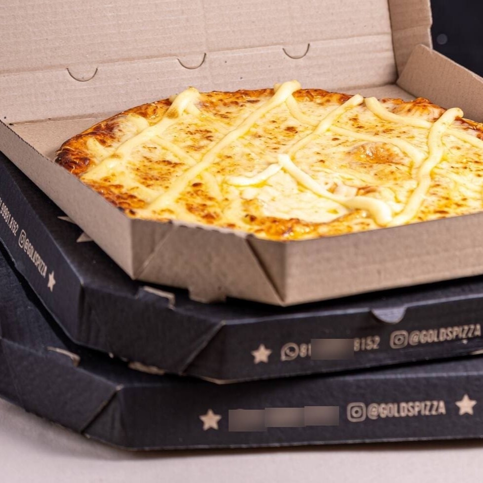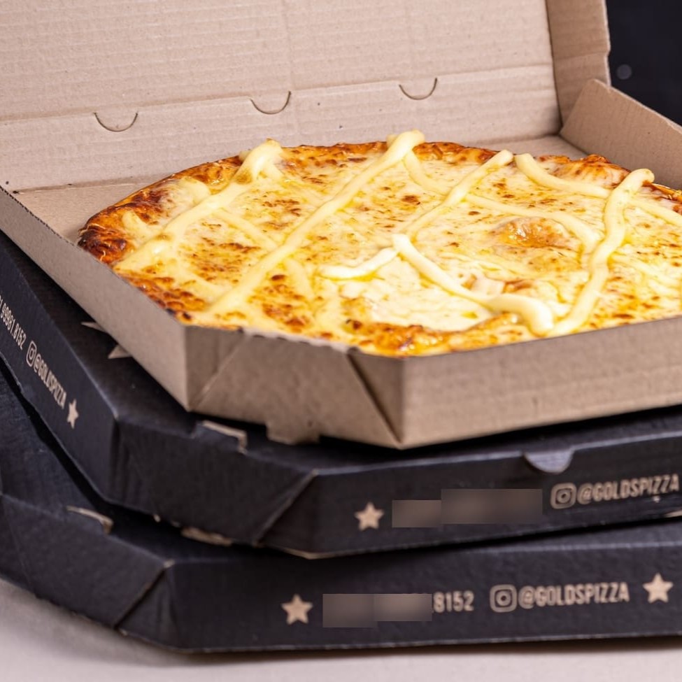 Massa fina, molho de tomate da casa, queijo mussarela, queijo parmesão, queijo provolone e Catupiry.