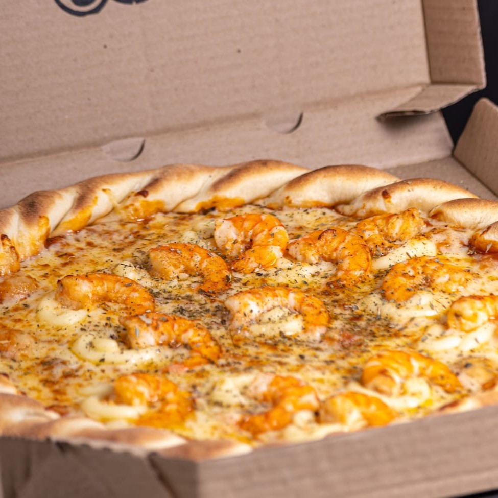 Massa fina, molho de tomate de casa, mussarela, camarão, Catupiry e orégano.