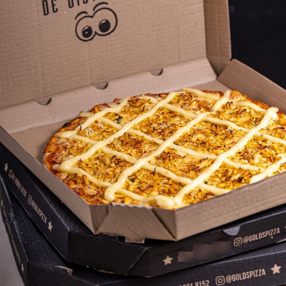 Massa fina, molho de tomate da casa, mussarela, frango desfiado, Catupiry, azeitona e orégano.