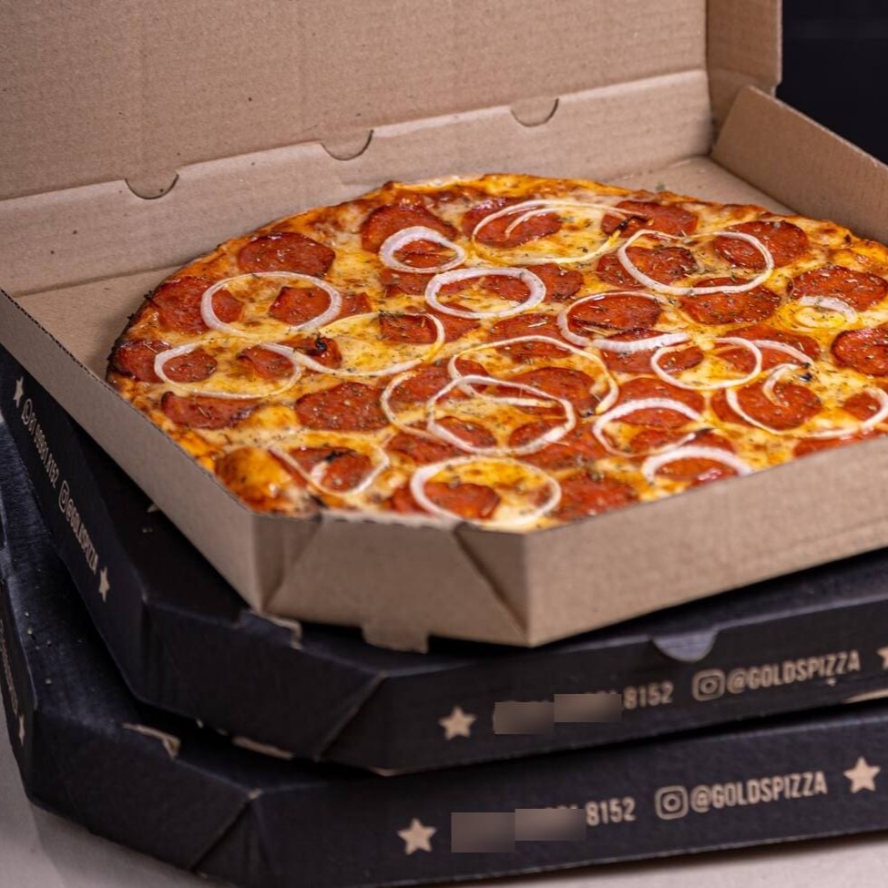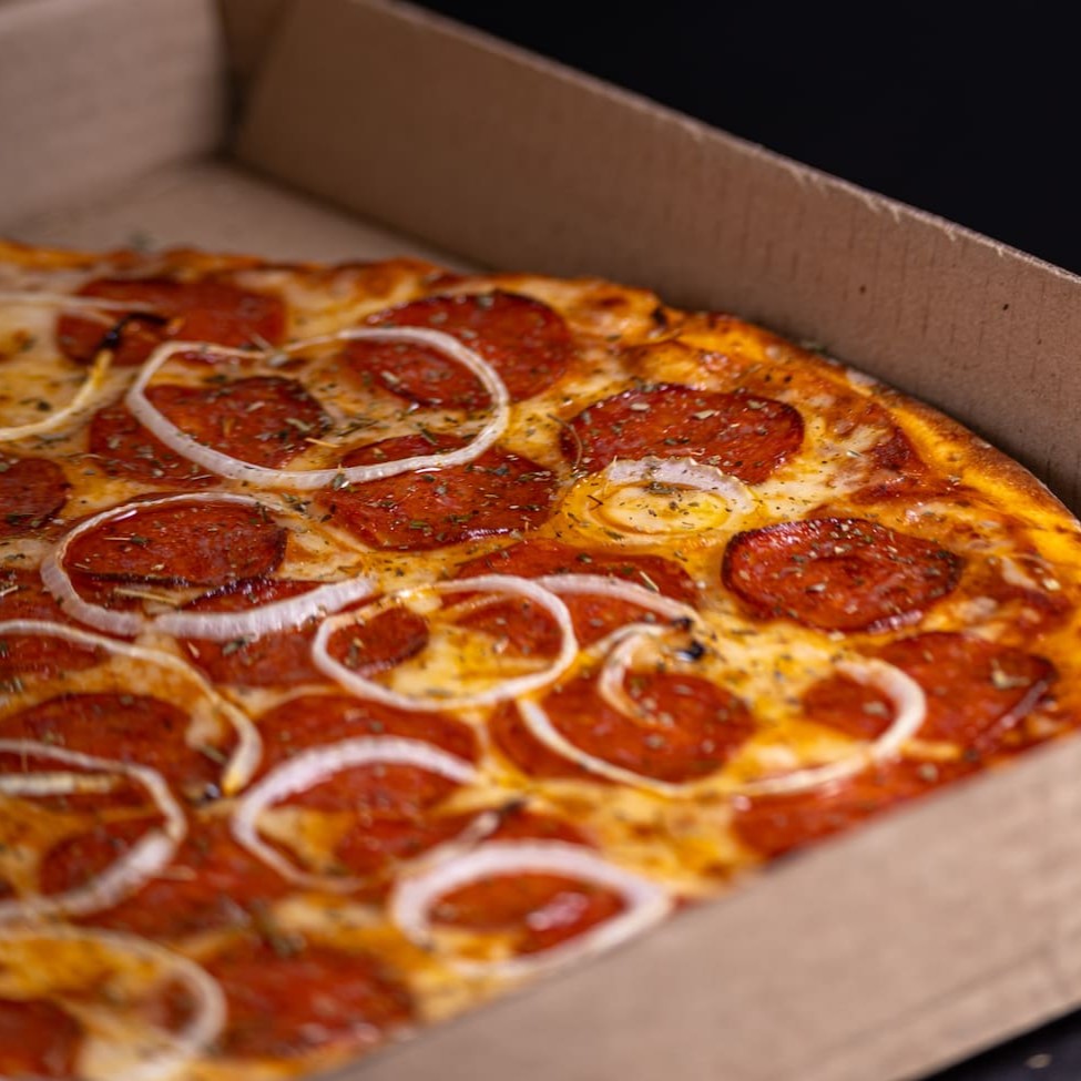 Massa fina, Molho de tomate da casa, mussarela, pepperoni, cebola e orégano.