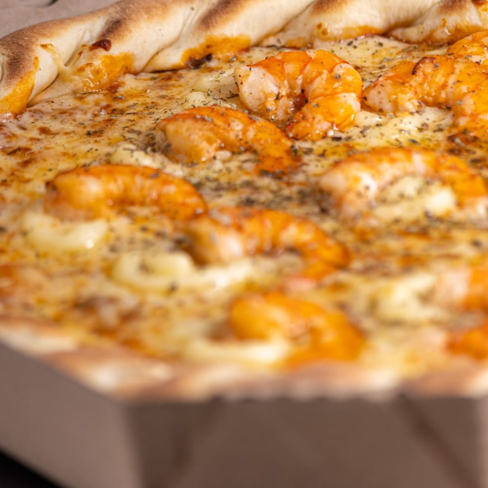 Massa fina, molho de tomate da casa, mussarela, camarão e orégano.