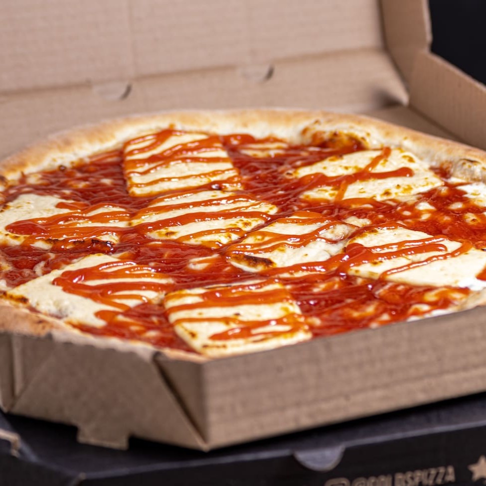 Massa fina, molho de tomate da casa, queijo mussarela, frango, bacon e barbecue.
