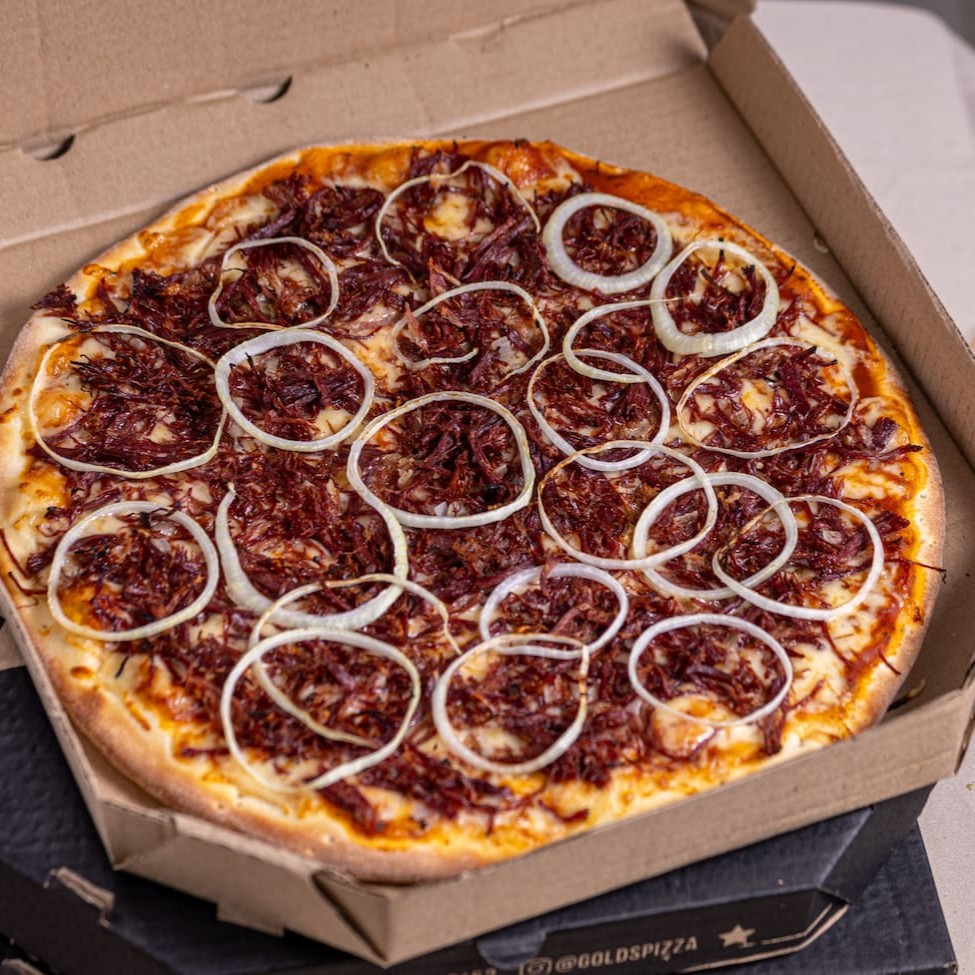 Massa fina, molho de tomate da casa, mussarela, charque desfiada, cheddar, cebola, azeitona e orégano.