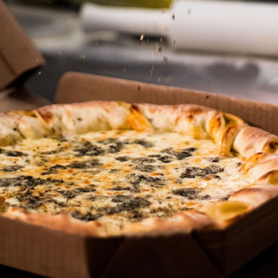 Massa fina, molho de tomate da casa, queijo mussarela, queijo parmesão, queijo provolone, queijo gorgonzola e Catupiry.