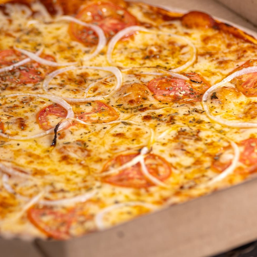 Massa fina, molho de tomate da casa, mussarela, tomate, cebola e orégano.