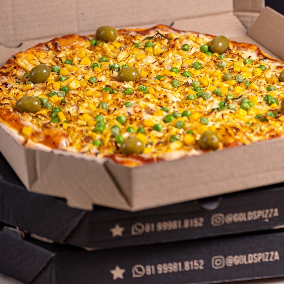 Massa fina, molho de tomate caseiro, queijo mussarela, frango desfiado, milho, ervilha e orégano.
