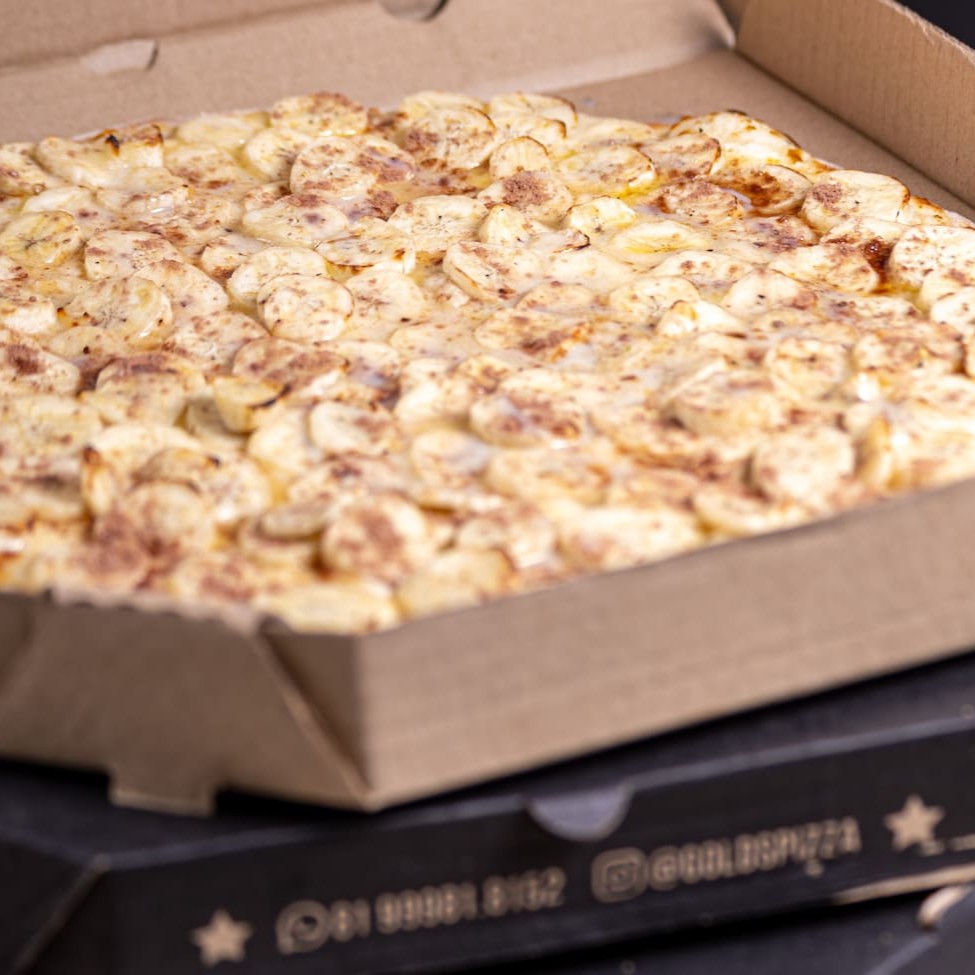 Massa fina, creme de leite, mussarela, banana, açúcar, canela e leite condensado.