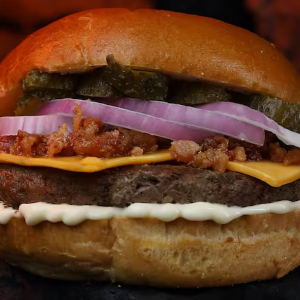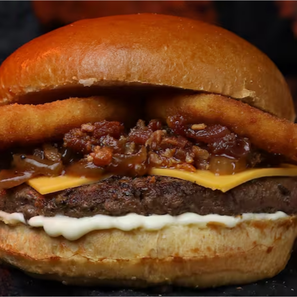 Pesado e suculento: pão brioche amanteigado, blend suculento de fraldinha 150g, queijo cheddar derretido no ponto certo, uma generosa camada de costela desfiada ao molho barbecue e anéis de cebola empanados pra dar aquele croc irresistível.