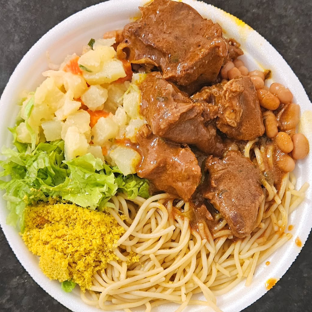 arroz,feijao,salada ,pure, farofa e um delicioso guizado de boi