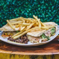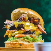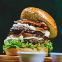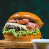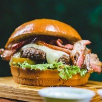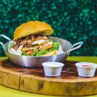 Pão bola, hambúrguer, frango, bacon, queijo, tomate, alface, cebola caramelizada, barbecue e creme de milho.