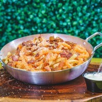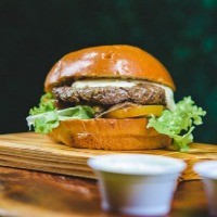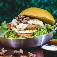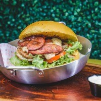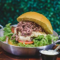 Pão bola, hambúrguer, charque desfiada, coalho, tomate, alface, cebola caramelizada, barbecue e creme de milho.