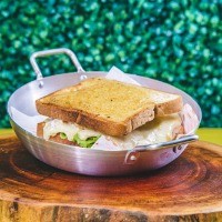 Pão de caixa, ovo, queijo, presunto, tomate, alface, cebola caramelizada e creme de milho.