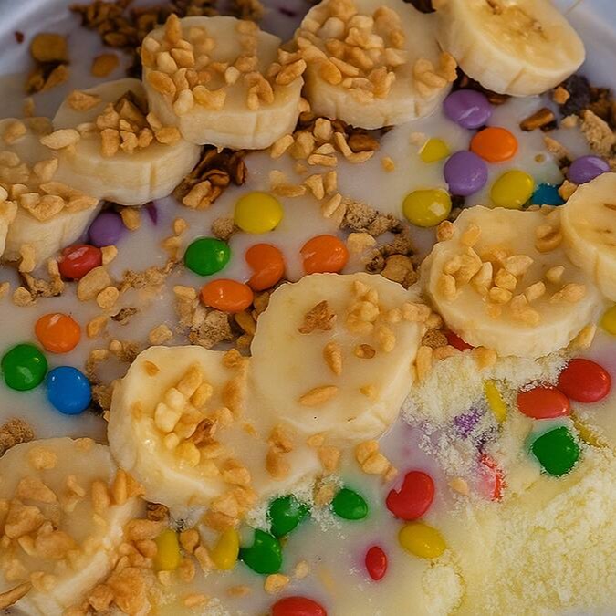 Ingredientes: leite condensado,leite em pó,granola, paçoca,m&m, banana