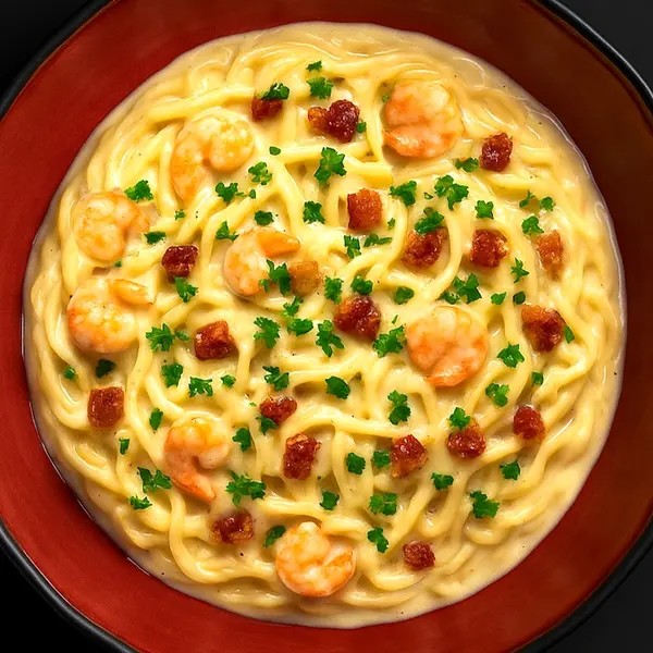 Carbonara de camarão com massa artesanal e molho feito com gema de ovo, queijo parmesão, molho branco e bacon. Gratinada com mussarela e parmesão.
