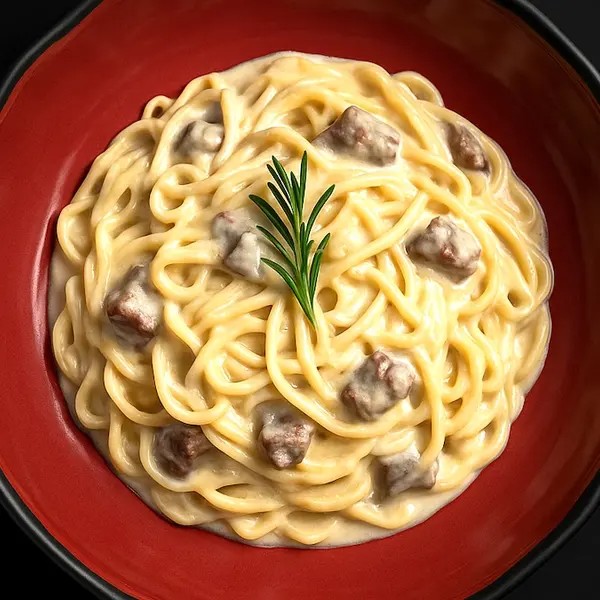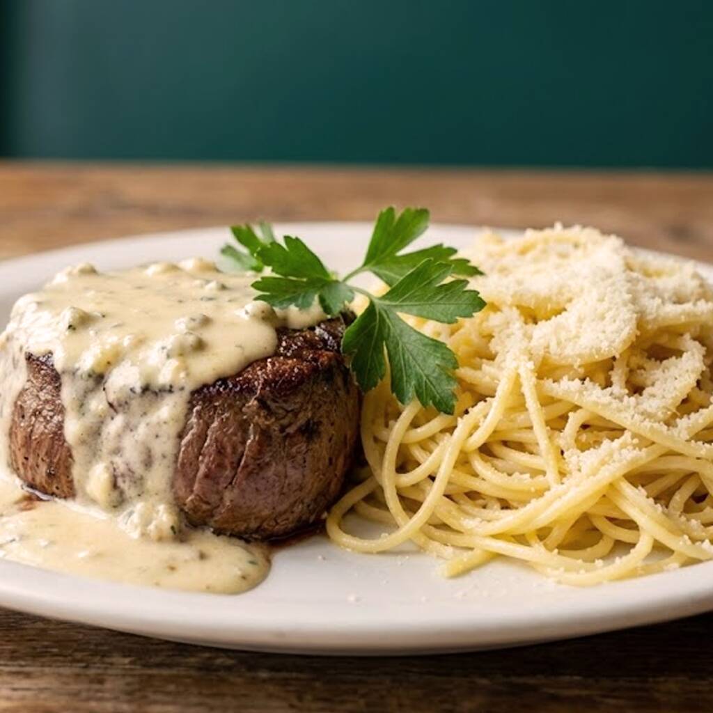 Filé mignon ao molho quatro queijos com gorgonzola. Acompanha espaguete na manteiga e parmesão.