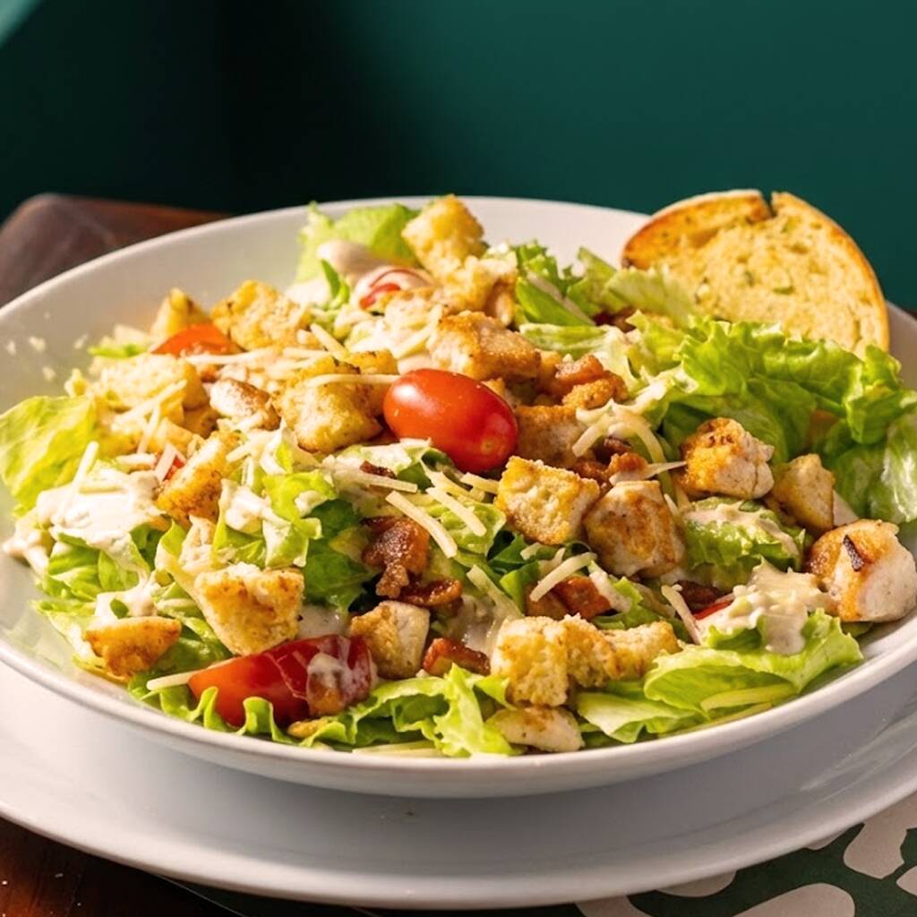 Alface americana, cubinhos de filé de frango, bacon, croutons, tomates-cerejas e parmesão ralado.