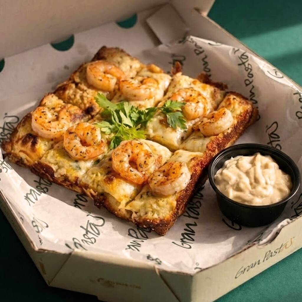 Pãozinho de pizza (8un), recheado com requeijão e gratinado com queijo mussarela, parmesão e camarão. Acompanha nosso molho pomodoro (caseiro) e creme de alho.
