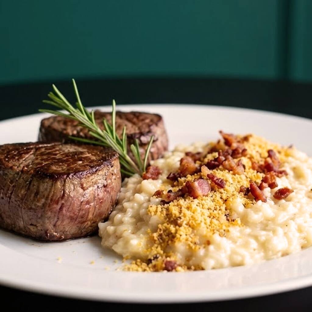 Filé mignon, risoto de parmesão, farofa crocante e bacon.