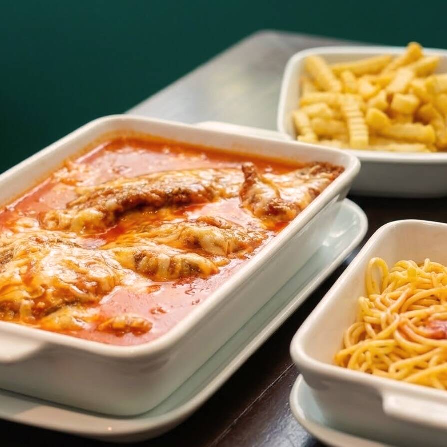 Filé de alcatra à milanesa, coberto com molho de tomate da casa e gratinado com mussarela e parmesão. Guarnecido com espaguette ao sugo.