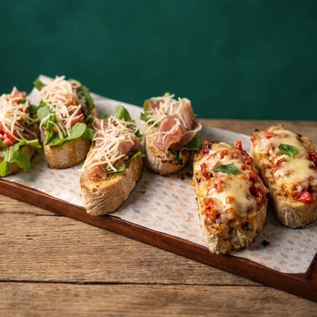Duas fatias de pão italiano, cobertas com tomate temperado, rúcula e queijo parmesão ralado, duas fatias com molho pomodoro da casa, recheadas com tomates temperados e finalizadas com queijo mussarela gratinado, e duas fatias com rúcula, presunto tipo Parma e parmesão.