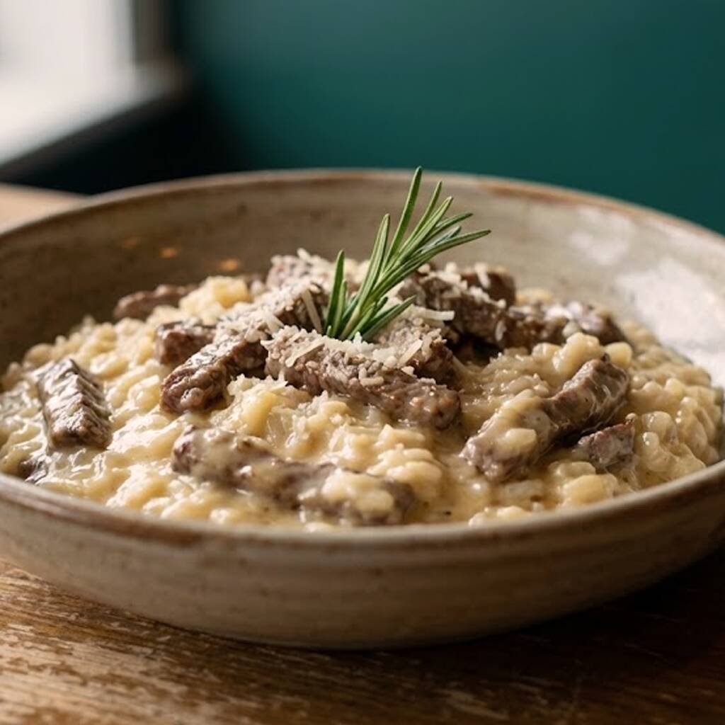 Delicioso risoto ao molho quatro queijos com tiras de filé mignon.