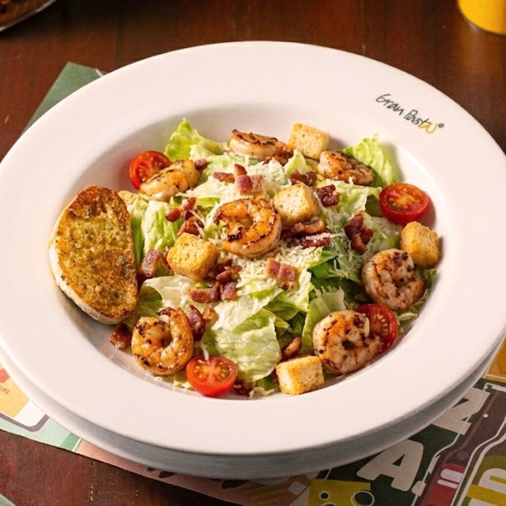 Alface americana, camarões refogados, bacon, croutons, tomates-cerejas e parmesão ralado.