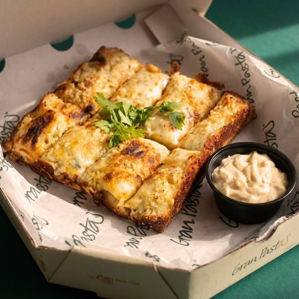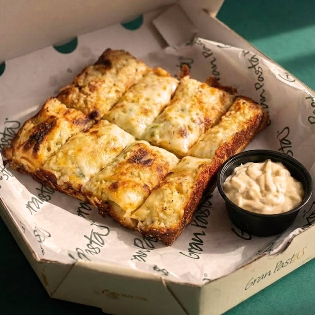 Pãozinho de pizza (8un), recheado com requeijão e gratinado com queijo mussarela e parmesão. Acompanha nosso molho pomodoro (caseiro) e creme de alho.