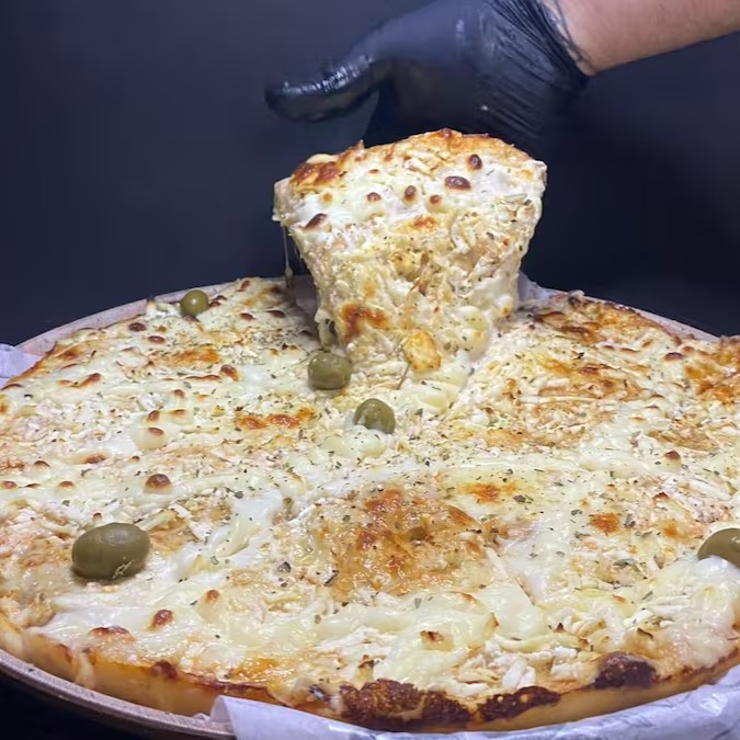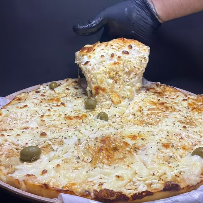 Pizza de frango com cheddar, molho de tomate, mussarela, orégano e azeitona, trazendo um sabor único e marcante.