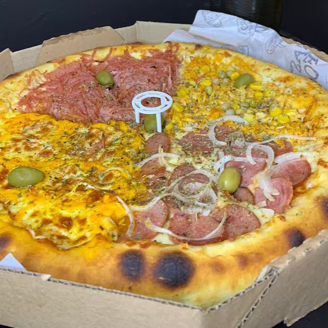 Uma deliciosa mistura de molho de tomate, mussarela, presunto, Calabresa, Frango, milho e ervilha, orégano e azeitonas, para quem gosta de variedades